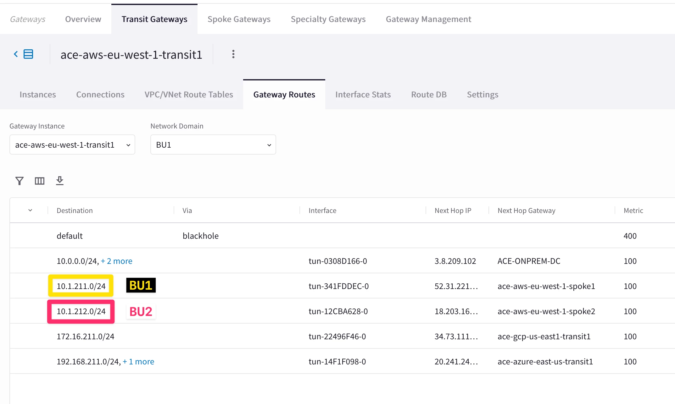 HINT: Go to CoPilot > Cloud Fabric > Gateways > Transit Gateways > select the relevant gateway > Gateway Routes and filter out based on any Network Domains.