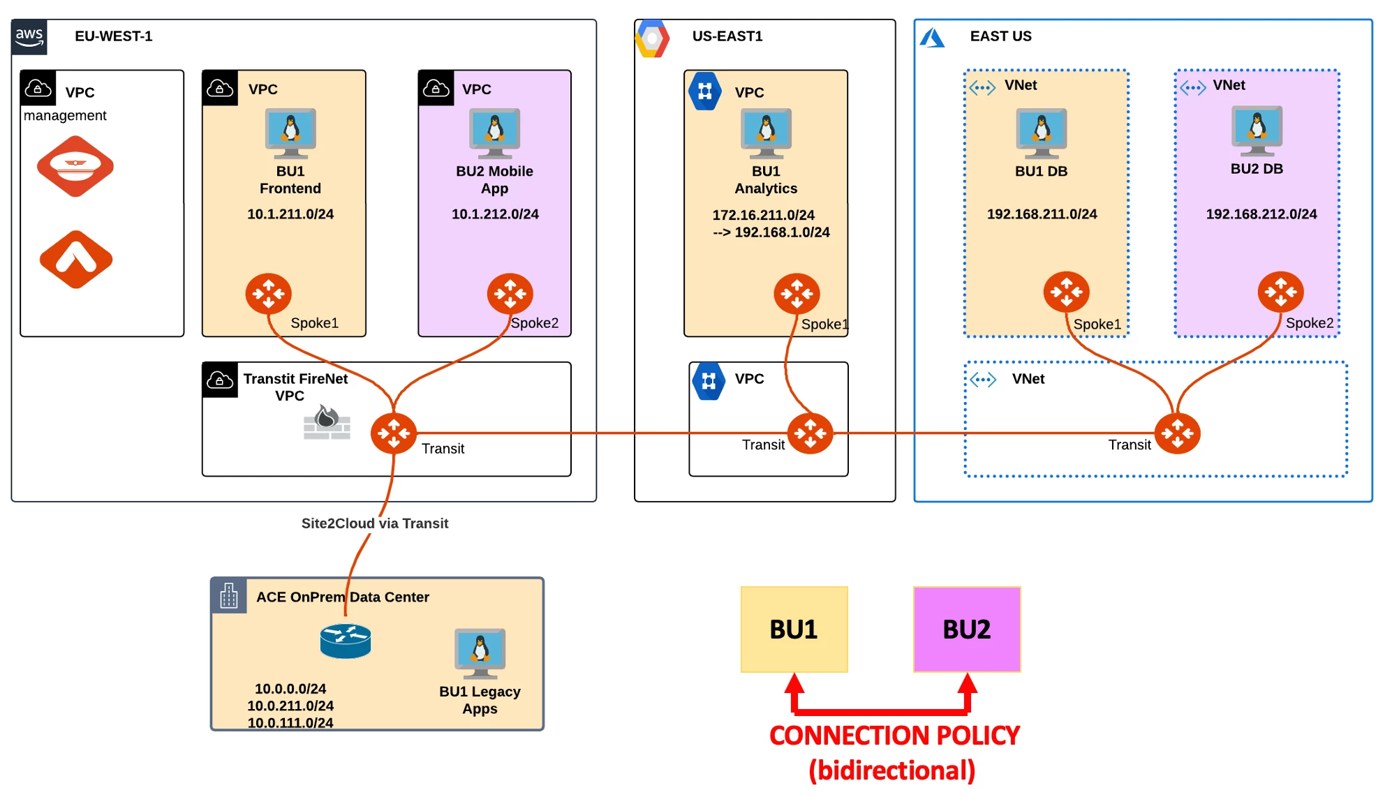 - Ping and SSH between the two BUs should finally work, thanks to the Connection Policy (aka VRF leaking).