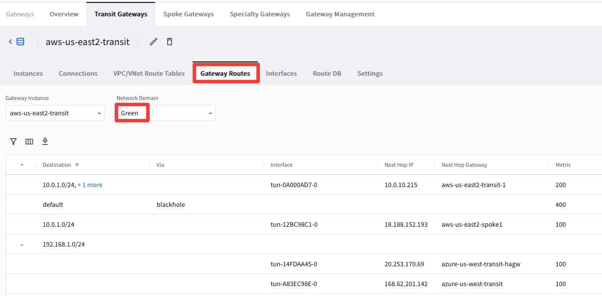 Then select the "Gateway Routes" tab and inspect the routing table of the network domain Green, likewise the routing table of the network domain Blue: