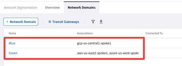 Create two network domains (Green and Blue) and associate them to their respective Spokes as follows: