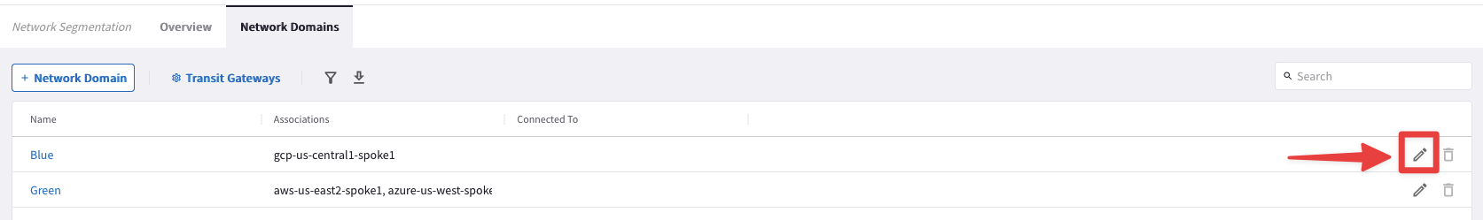 Go to CoPilot > Networking > Network Segmentation > Network Domains > Transit Gateways: