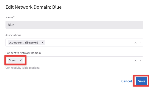 Select the appropriate option from the Connect to Network Domain pull-down menu (Green shown here). Then click Save: