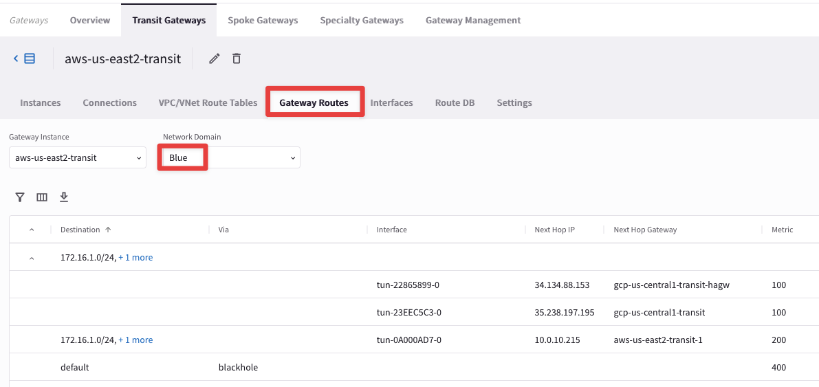 Go to CoPilot > Cloud Fabric > Gateways > Transit Gateways and select the Transit Gateway aws-us-east2-transit: