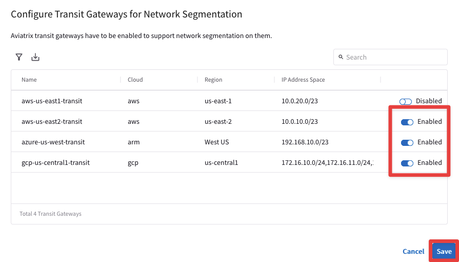 Enable all three Aviatrix Transit Gateways in Azure, GCP and AWS (us-east-2 only for now) for network segmentation as shown below: