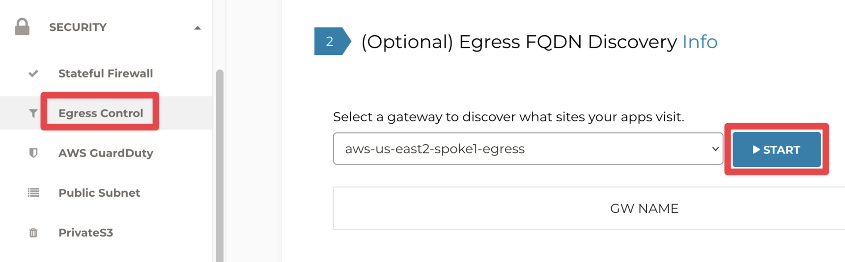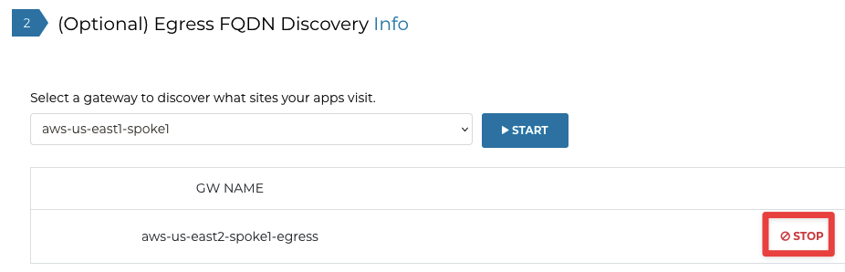 Select aws-us-east2-spoke1-egress from the dropdown menu and click START: