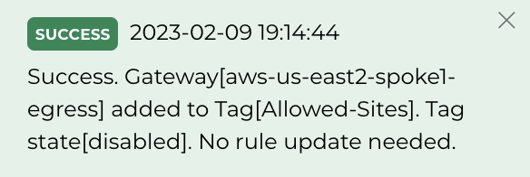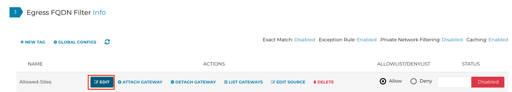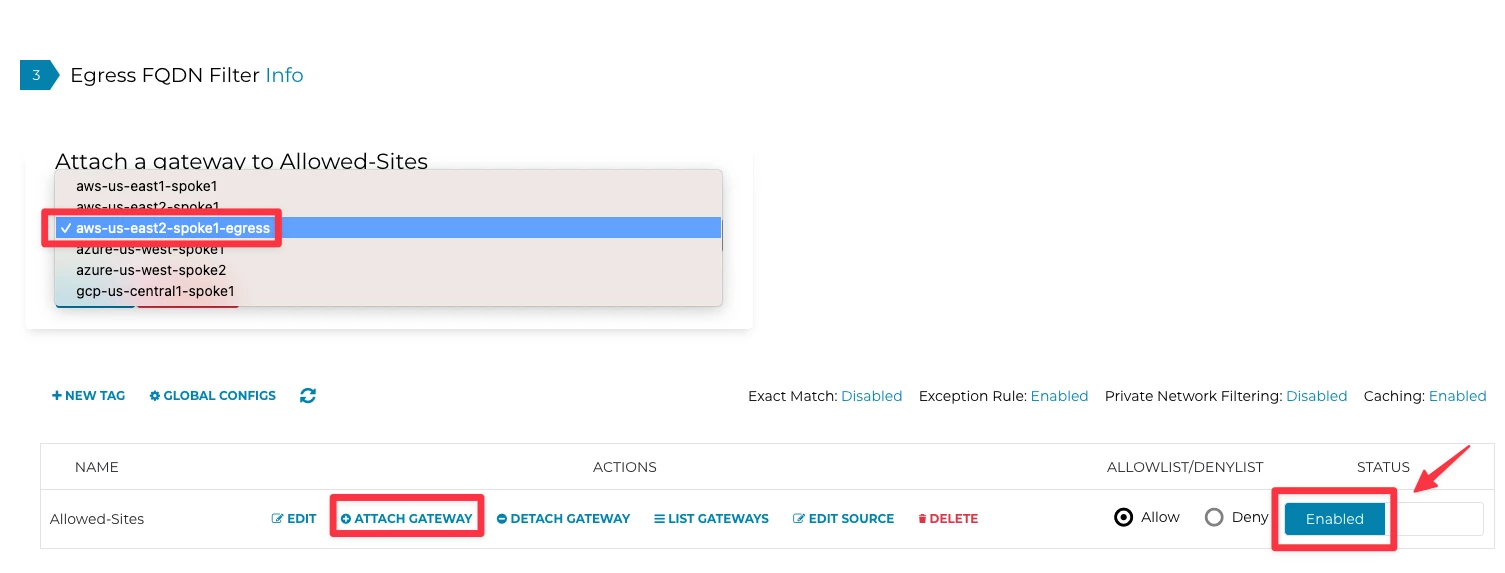 Click on Attach Gateway to attach the Egress gateway to the Tag Allowed-Sites and do not forget to switch the Status to Enabled on the far-right side