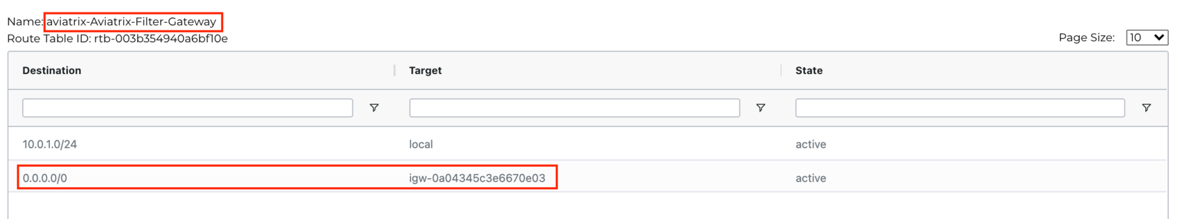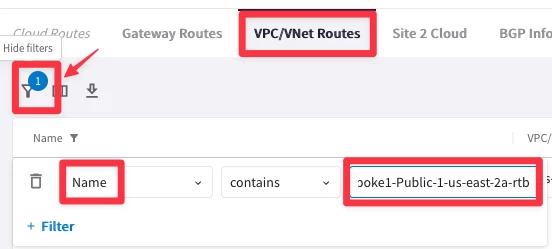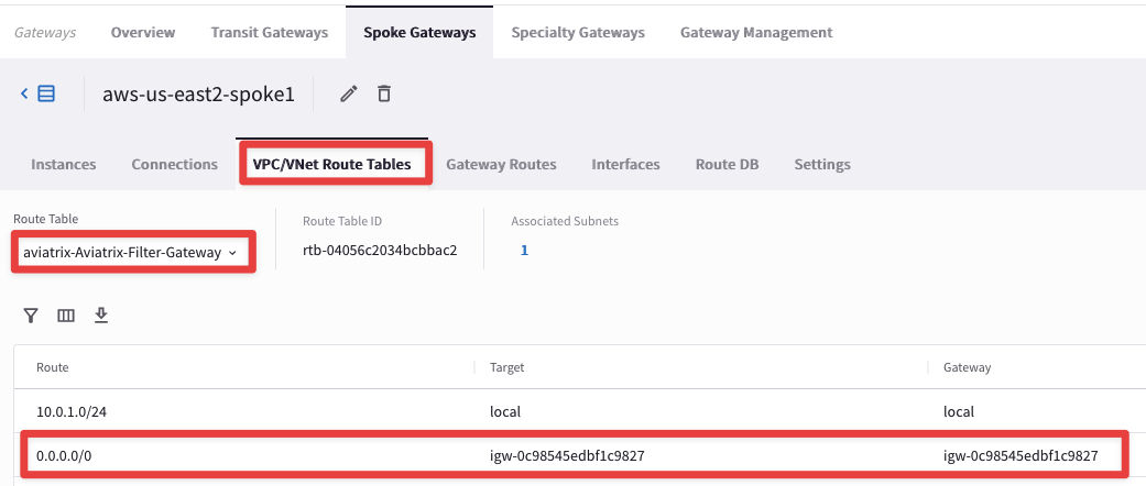 Select the "VPC/VNet Route Tables" tab, and then select the route table "aviatrix-Aviatrix-Filter-Gateway"