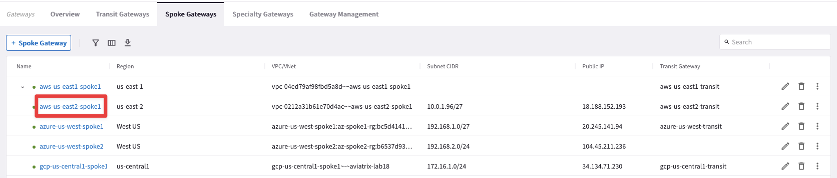 Go to CoPilot > Cloud Fabric > Gateways > Spoke Gateways and click on the Spoke Gateway aws-us-east2-spoke1: