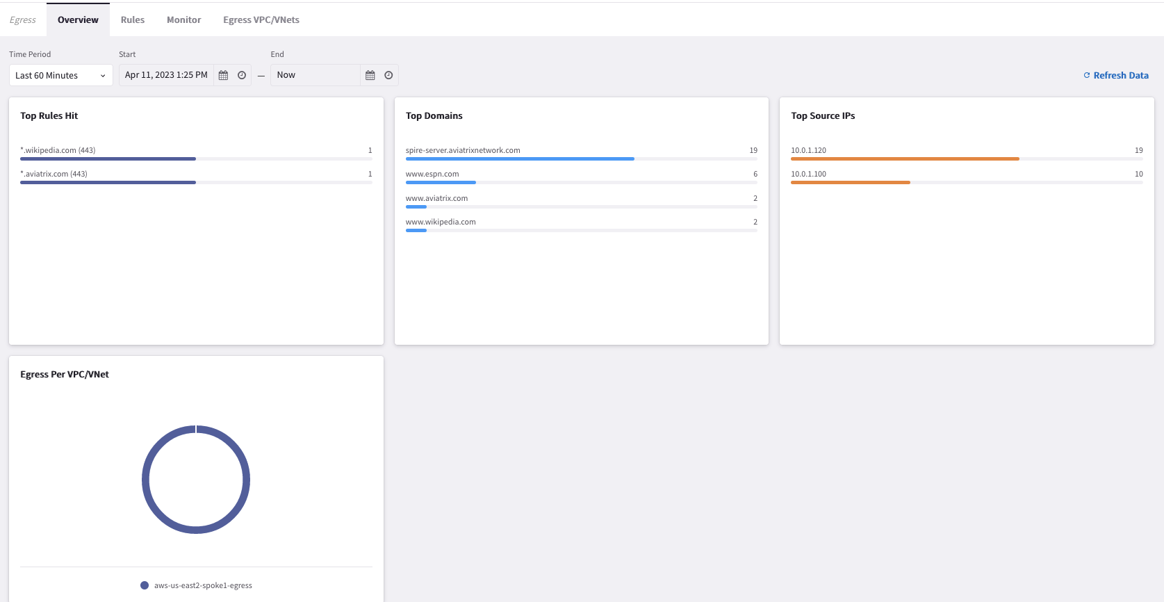 Go to CoPilot > Security > Egress > Overview (default tab) and filter by Last 60 Minutes.