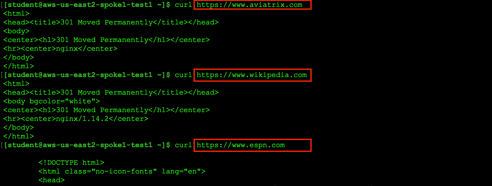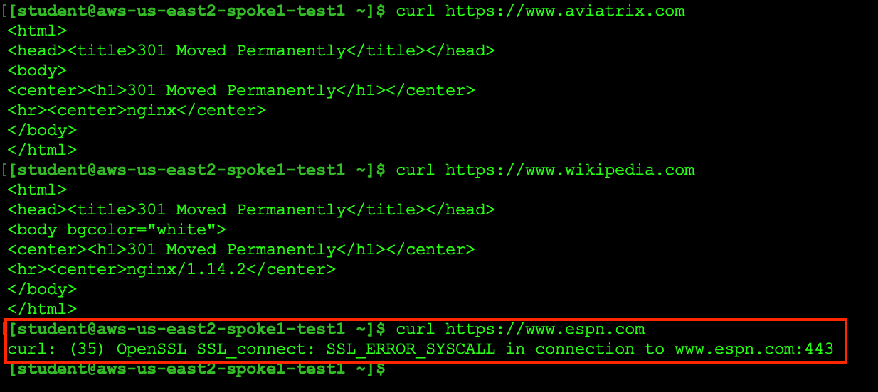 Now try to curl the same sites again. Only aviatrix.com and wikipedia.com on TCP/443 will work because of the egress policy created in this lab.