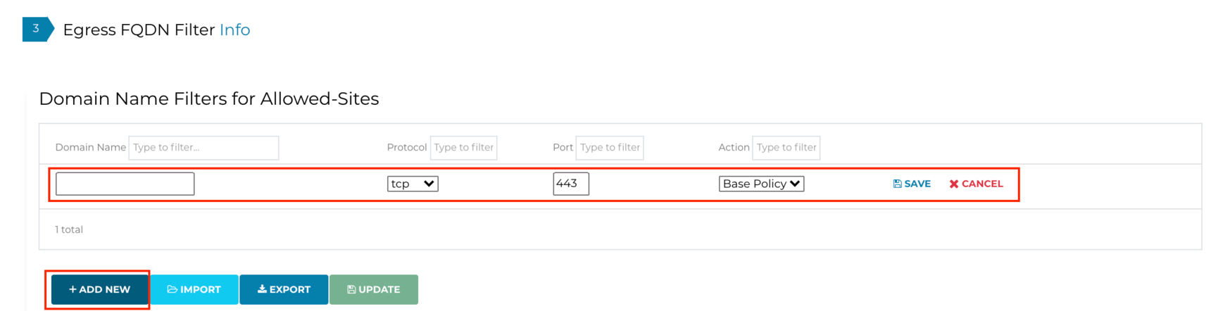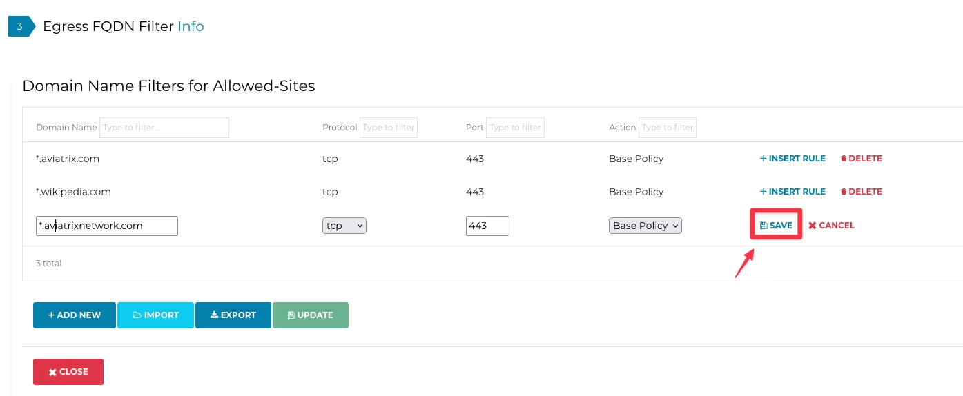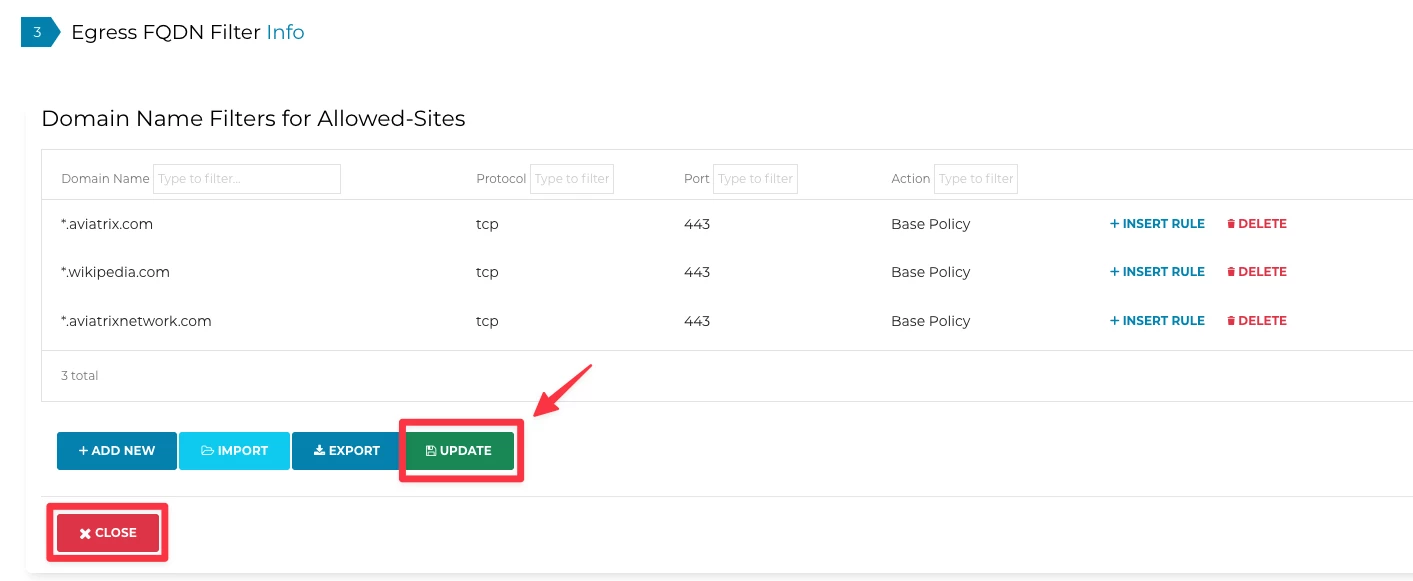 Go to Controller > SECURITY > Egress Control > (Step 3) Egress FQDN Filter