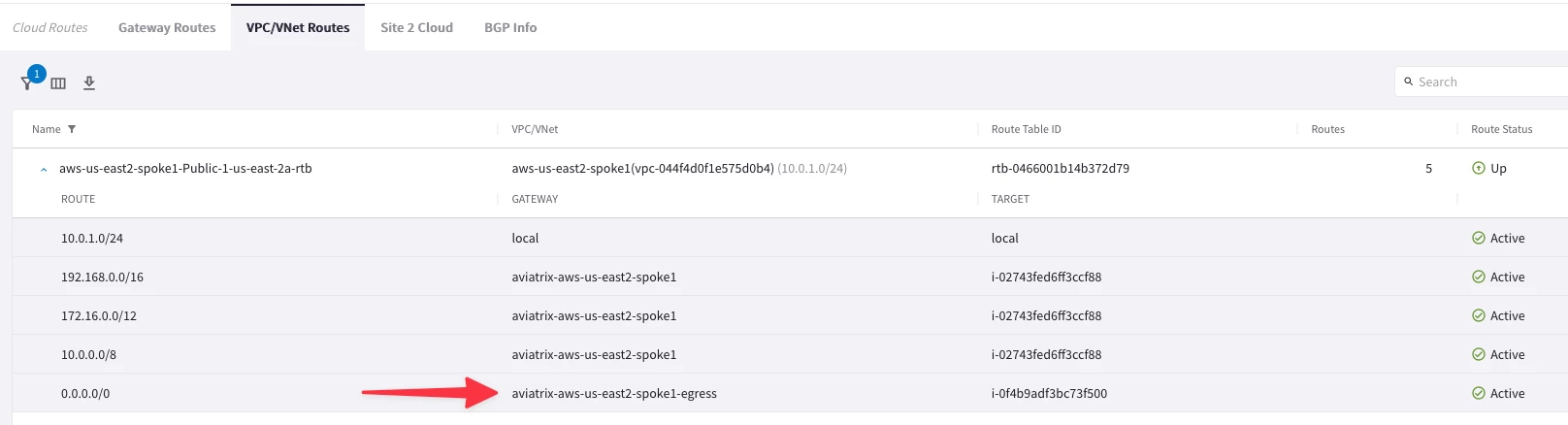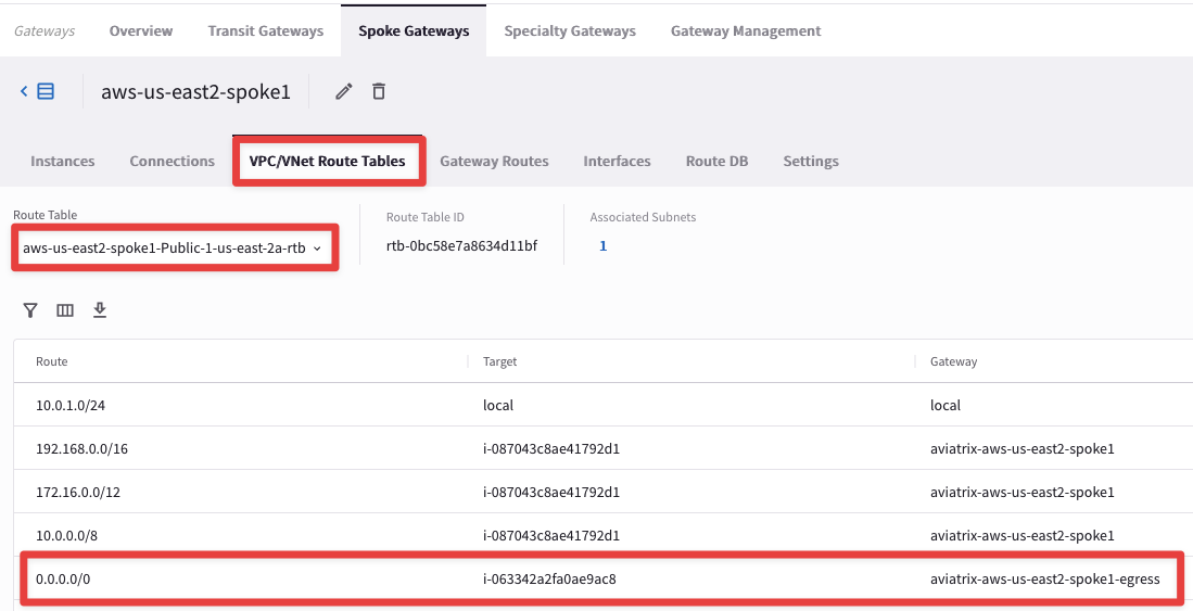 Filter for aws-us-east2-spoke1-Public-1-us-east-2a-rtb as per the below diagram. You can also see that the default route is pointing towards the Egress FQDN Filtering Gateway: