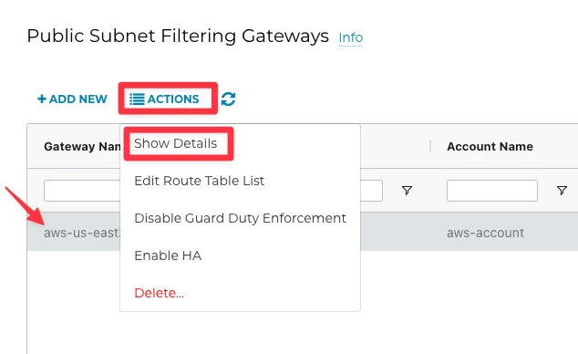 Go to Controller > SECURITY > Public Subnet > select the row with the egress gateway > ACTIONS > Show Details