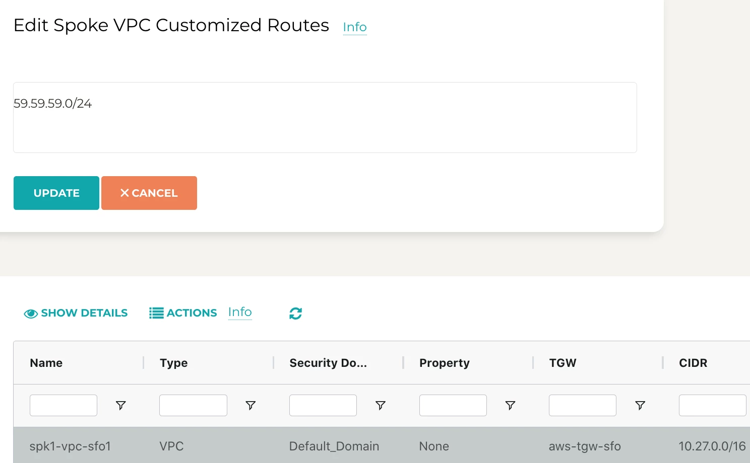 If a new spoke VPC CIDR is added/deleted or a new VPC route is added/deleted, clicking this option updates VPC attachments without having to detach the VPC first.