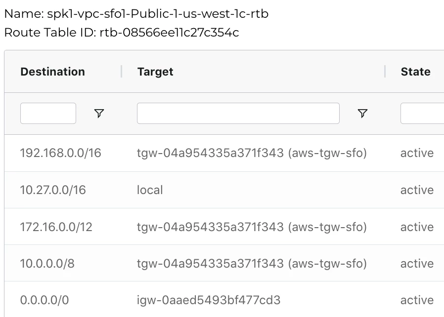 By default, RFC 1918 summarized routes and learned non RFC 1918 specific routes are dynamically programmed into each Spoke VPC’s route table. This feature allows enterprises to statically program specific routes whose target is TGW.