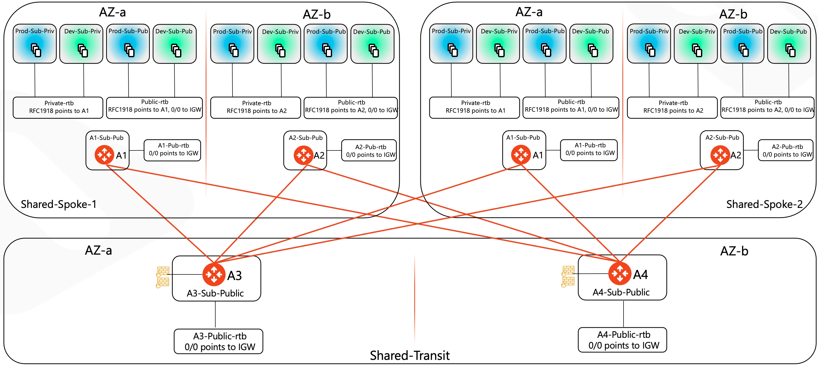 Here’s the Aviatrix architecture for AWS Shared VPCs where admin is creating shared resources for Prod and Dev accounts: